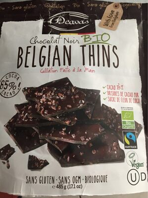 Organic Dark Chocolate Belgian Thins is a dark chocolate with 70% cacao content from Kakao from Peru, Product of Belgium, Almonds from Italy, Coconut from Sri Lanka.